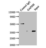 Immunoprecipitating GAPDH in Hela whole cell lysate. Lane 1: Mouse control IgG; Lane 2: CSB-MA000071M0m (3μl) + Hela whole cell lysate (500μg); Lane 3: Hela whole cell lysate (20μg)